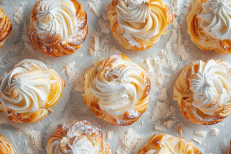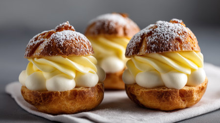 A tempting display of cream-filled pastries dusted with powdered sugar, perfect for any gathering or celebration. Simple yet elegant dessert presentation.
