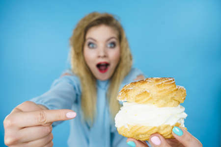 Sweets, junk food, sugar temptation on diet concept. Woman holding sweet delicious cream cupcake