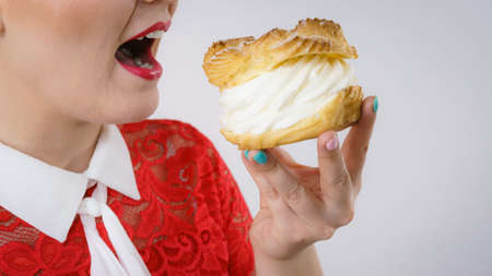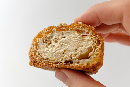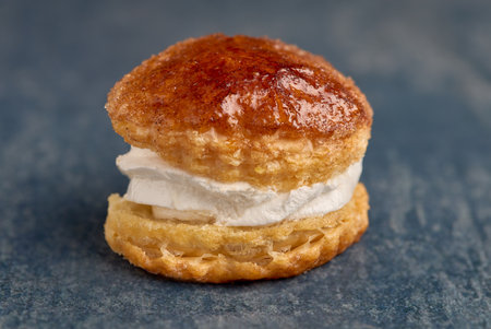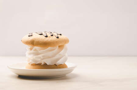 Pastry biscuit filled with whipped cream isolated on gray background. Close up. Concept: bakery, french dessert.