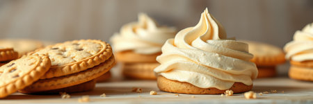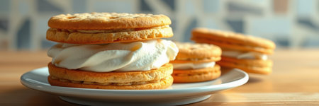 Delicious dessert sandwiches made with crispy cookies and creamy filling on a wooden table in a cozy setting