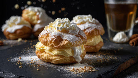 AI Generated. Cream puffs with whipped cream is a classic French dessert also called choux pastry, on black slate board, dusted with sugar powder