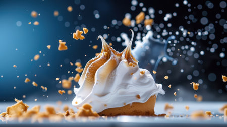 A stunning close-up of a creamy dessert featuring swirls of meringue and crispy crumbs, perfectly capturing the dynamic motion of splattering ingredients.
