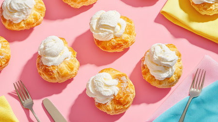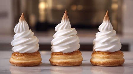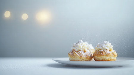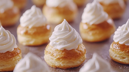 A stunning arrangement of cream puff desserts filled with luscious whipped cream, topped with delicate garnishes on a neutral plate. Perfect for showcasing culinary excellence in any setting.