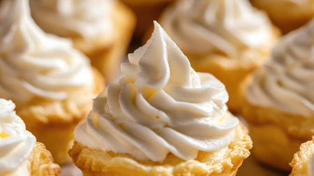 Neatly arranged coconut cream puffs with golden pastry crust and whipped coconut cream swirl tops