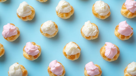 Eclairs with whipped cream frosting evenly spreaded on blue background, top view, minimal flat lay style.