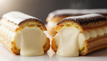 Macro shot of eclairs sliced open, revealing rich creamy filling. Soft warm lighting and shallow depth of field emphasize luxury pastry quality, perfect for gourmet branding and editorial use. High quality photo