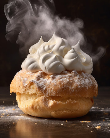 a freshly baked cream puff, showcasing the contrast between the warm pastry and the cool, creamy filling. Generative AI.