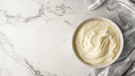 A bowl filled with smooth and creamy white frosting rests on a marble countertop, creating an elegant display for any baking project or dessert creation in a stylish kitchen setting.