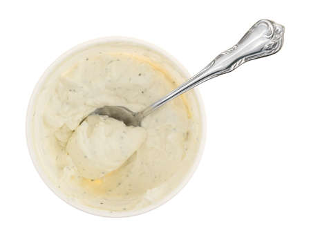Top view of a container of fresh French onion dip with a spoon inserted into the food isolated on a white background.