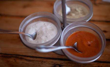several sauces of European cuisine. Several sauces : mayonnaise, ketchup, horseradish. Top view on european cuisine food on wooden background.