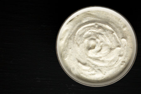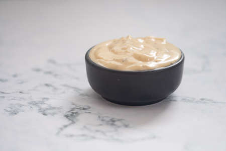 Caesar salad cream in a black cup on marble table