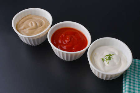 Set of popular sauces: ketchup, dijon mustard and mayonnaise in small white bowls on black background. top view