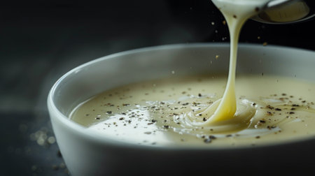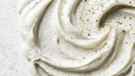 An exquisite close-up of creamy white sauce displaying intricate swirls and specks of spice, perfect for culinary projects, cooking blogs, and food styling.