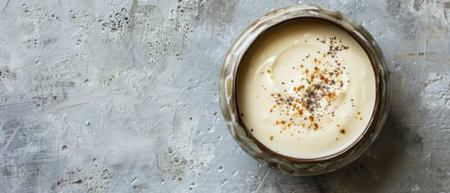 A close-up view of a small brown bowl filled with a creamy white sauce. The sauce is topped with black pepper and other spices. The bowl rests on a textured grey surface.