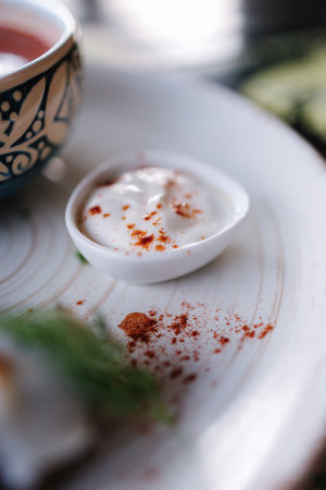 Close-up of creamy remoulade with cajun seasoning texture for culinary design