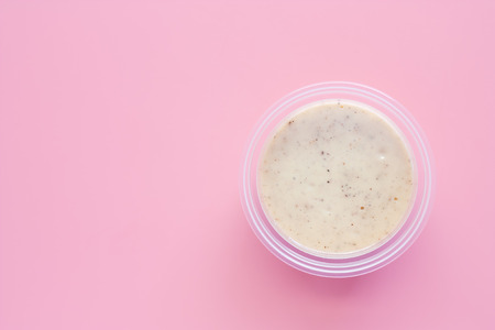 Homemade salad dressing in plastic bowl on pink background for food and eating concept