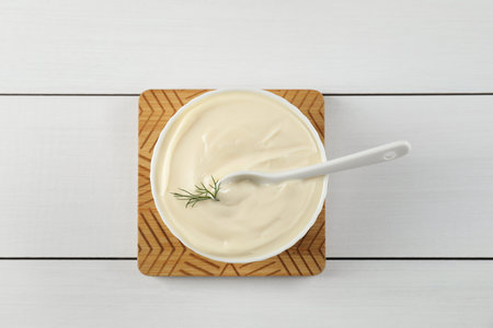 Fresh mayonnaise sauce in bowl on white wooden table, top view