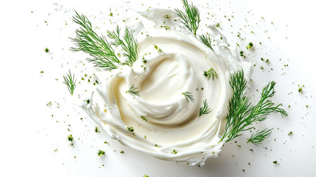 photo of creamy white sour cream splash with dill, high-contrast lighting, shot from above, isolated on white background, photography, advertising media --ar 16:9 --style raw --v 6.1 Job ID: aacfb3df-3fc8-47d0-a356-c310f1c5fbae