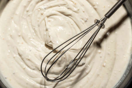 A close-up image of a creamy, freshly made culinary sauce showcasing a whipped texture, perfect for enhancing the flavor of various dishes and culinary creations.