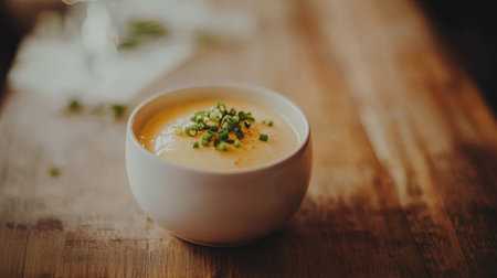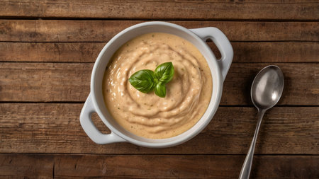 Overhead shot of comforting creamy soup garnished with fresh basil, served in a white bowl on a rustic wood surface Perfect for food blogs and recipes.