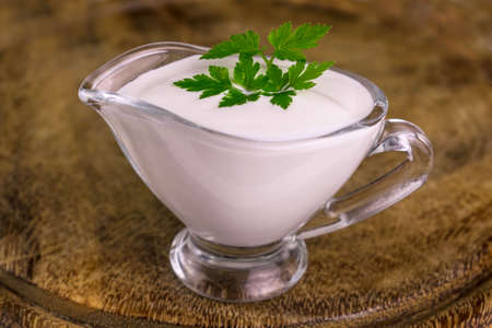 Sauce-boat with sour cream garnished with parsley. Close-up.