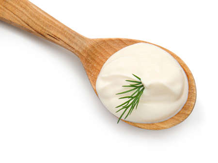 Spoon with tasty sour cream on white background