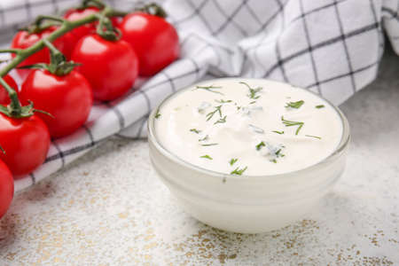 Bowl of sour cream yogurt on grey background