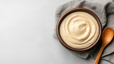 Mayonnaise swirl in white bowl next to wooden spoon with mayo. Place for your text