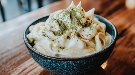 A close-up of creamy green tea ice cream topped with a dusting of matcha powder on rustic wood