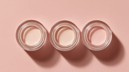 Three clear glass jars sit on a soft pink surface, each containing a different creamy product ideal for skincare.