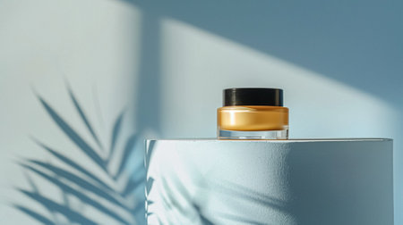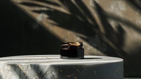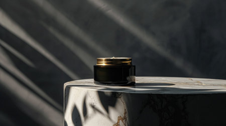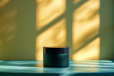 A sleek black cosmetic jar rests on a reflective glass surface, illuminated by the warm golden light casting geometric shadows.