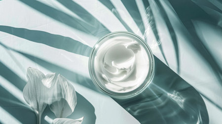 Mock up of moisturizing cream in jar and palm leaf shadow. Minimalism. Beauty, skincare, spa and cosmetic concept. Top view. Hard light.