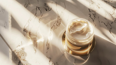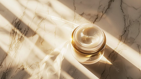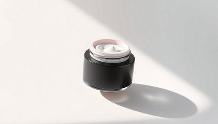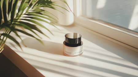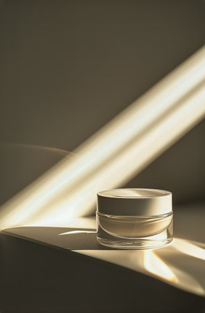 Soft sunlight illuminates a clear jar of skincare cream resting on a light-colored surface, creating a serene and calming atmosphere that highlights the product.