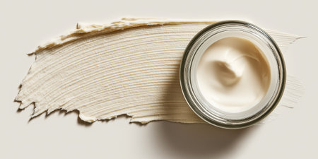 Open jar of face cream with texture swiped beside it, top view, clean beauty product concept.