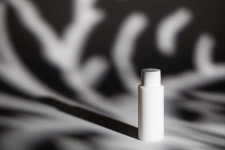 Blank white plastic bottle of cosmetic product on table against shadows space for design