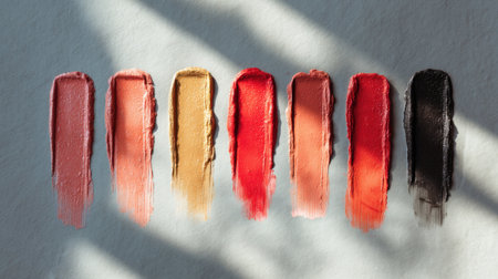 This image showcases a beautiful arrangement of assorted lip colors on a soft surface, highlighting the artistry and vibrant hues with shadows and textures.