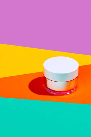 Closed glass cream pot with copy space for your brand isolated on bright colored background. Mockup