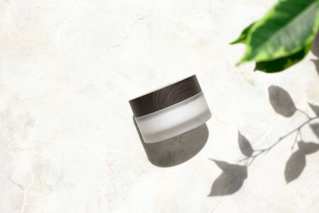 a beautiful white jar of cream on the marble floor in the shade of leaves from the bright sunlight. Summer composition flat lay
