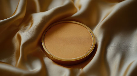 A golden cosmetic compact is artfully arranged on soft satin fabric, revealing a luxurious and elegant aesthetic perfect for beauty-themed photography and branding.