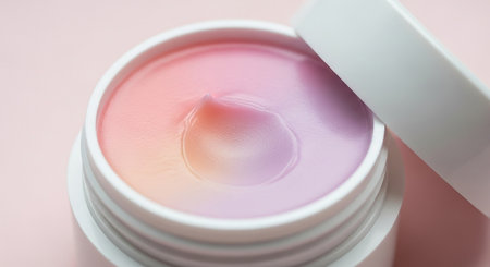 Overhead shot of an open jar of white cream on a colorful painted background, showcasing a skincare product.
