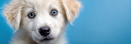 Portrait of a white dog on a blue background with copy space