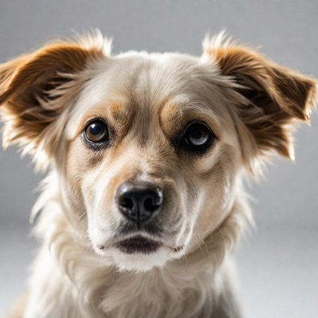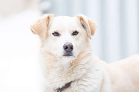 Adorable close-up of light-colored dog looking inquisitively, perfect for pet adoption, animal lovers, and branding.