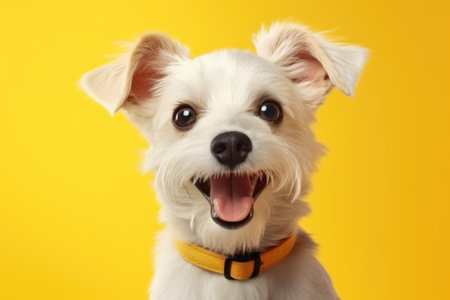 cute happy dog on yellow background, AI Generated