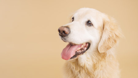 Golden retriever panting and looking away on beige background