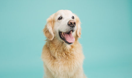 Golden retriever panting and looking up on turquoise background