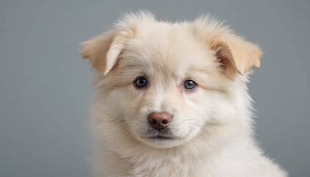 Portrait of a cute white Pomeranian puppy on grey background