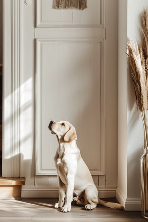 A Labrador Retriever dog sits by a white door in a cozy, sunlit room, exuding calmness and warmth. The setting features minimalistic decor, including dried pampas grass, emphasizing serenity and coziness.