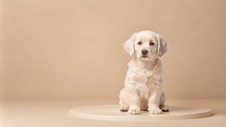 Adorable golden retriever puppy sitting on a white platform against a beige background.