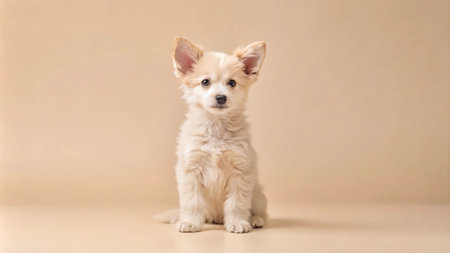 Adorable white puppy with floppy ears sits on a beige background, looking directly at the camera.