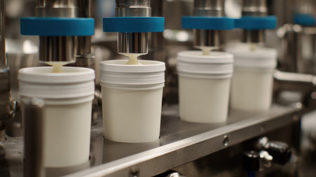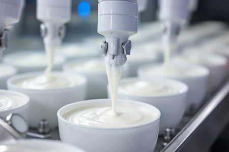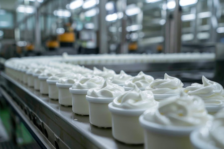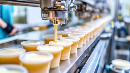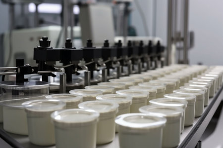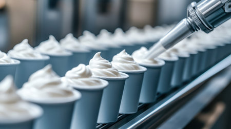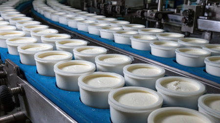 This image showcases the yogurt production process in a factory setting, highlighting the conveyor system with rows of containers ready for packaging.